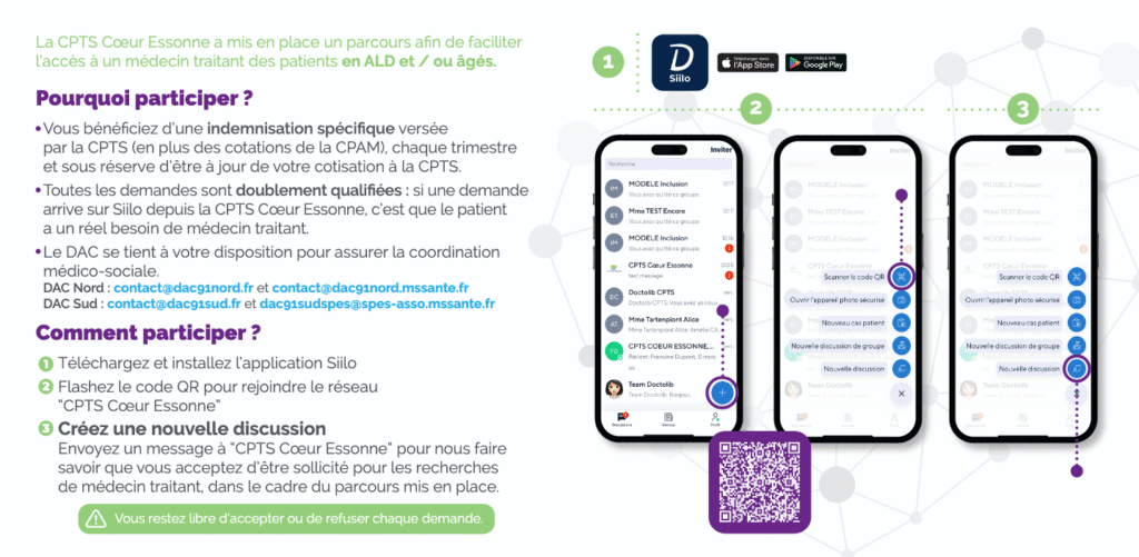 Un cadre rassurant est garanti par la sélection rigoureuse des demandes adressées via SIILO. Les équipes de la CPTS veillent à qualifier chaque situation en amont, pour ne vous orienter que les patients correspondant aux critères de vulnérabilité.