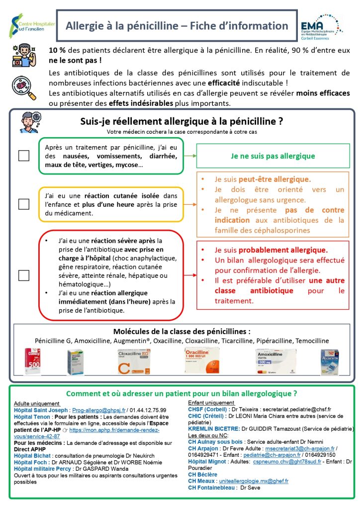 En complément, le CHSF met à disposition une plaquette d’information synthétique sur l’allergie à la pénicilline, véritable outil d’aide à la décision pour la pratique quotidienne. Ces ressources visent à sécuriser les prescriptions, harmoniser les pratiques et améliorer la qualité des soins sur le territoire.
